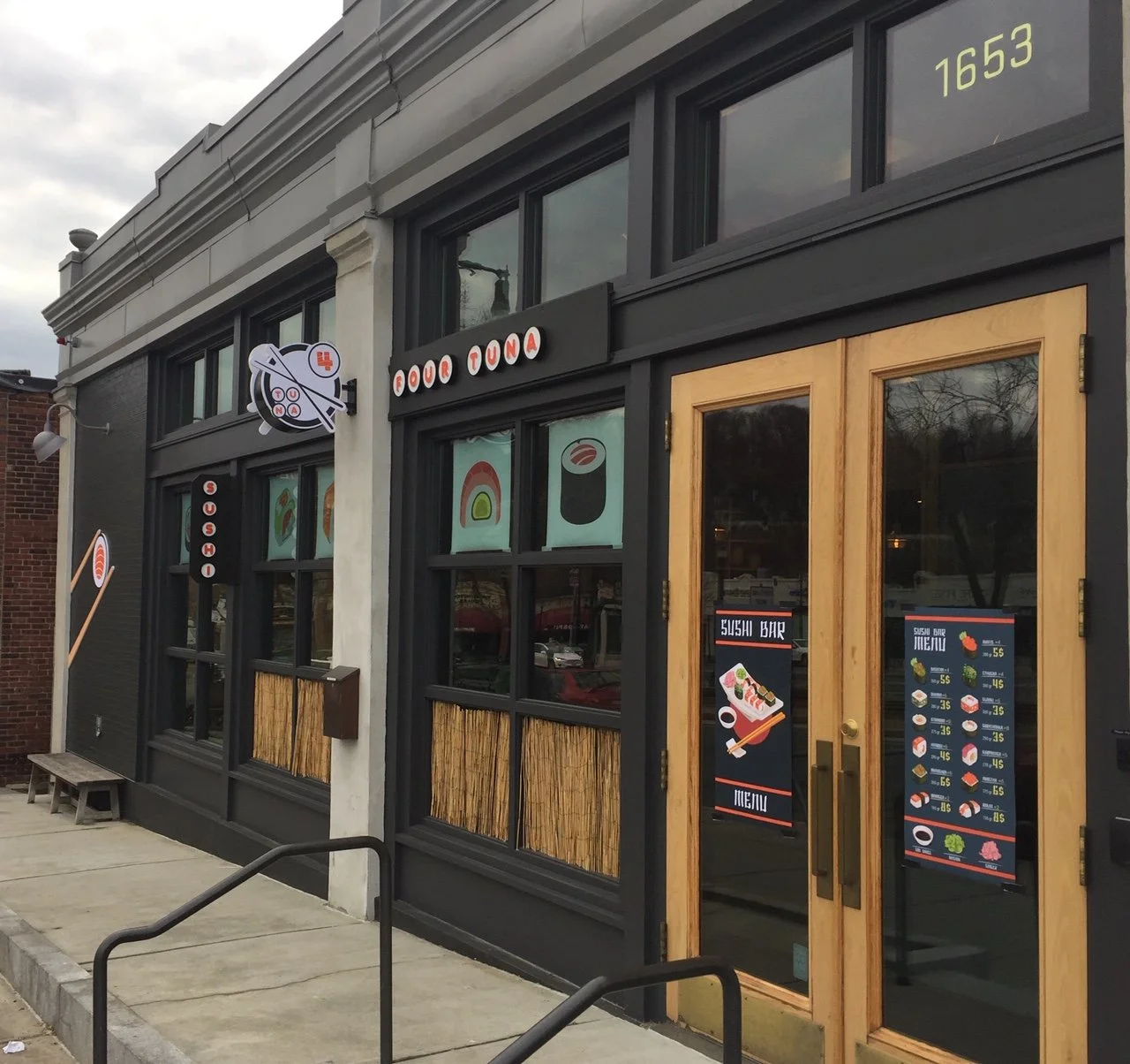 Image above was our retail storefront/studio turned into a sushi bar. Custom back-lit signage, giant wall graphics, tables set and even menus left the neighborhood abuzz with the idea of a new sushi restaurant.